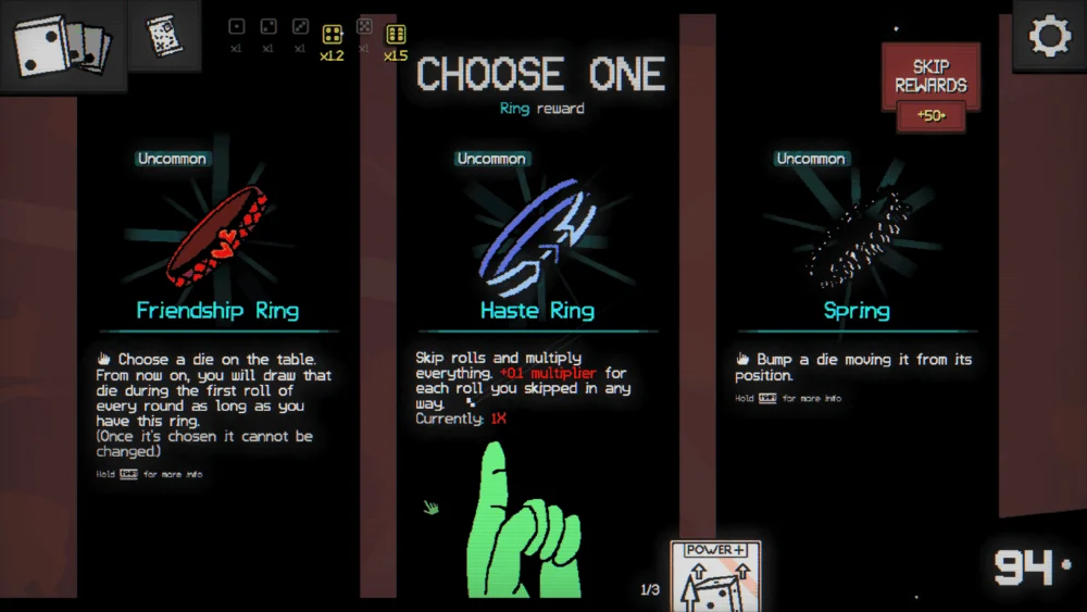 The strategy lies in the interaction between these rings and the specific dice in a player’s inventory. Some rings might trigger additional points when a specific shape of die is rolled, while others might provide a global multiplier for every consecutive successful roll. One notable mechanic involves player agency regarding die positioning. While the game generally lacks direct control over where dice land, certain rings allow players to "bump" or reposition a die before the final score is tallied. This represents one of the few moments of tactile interaction in an otherwise RNG-heavy (random number generation) experience.